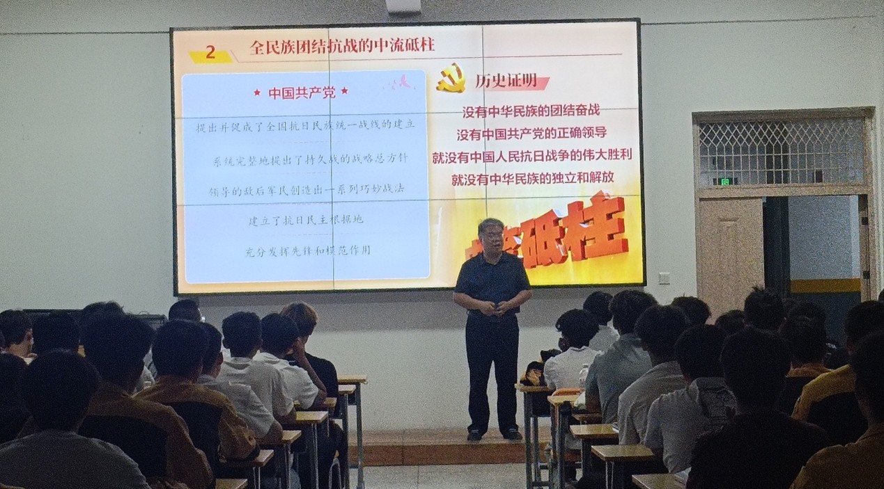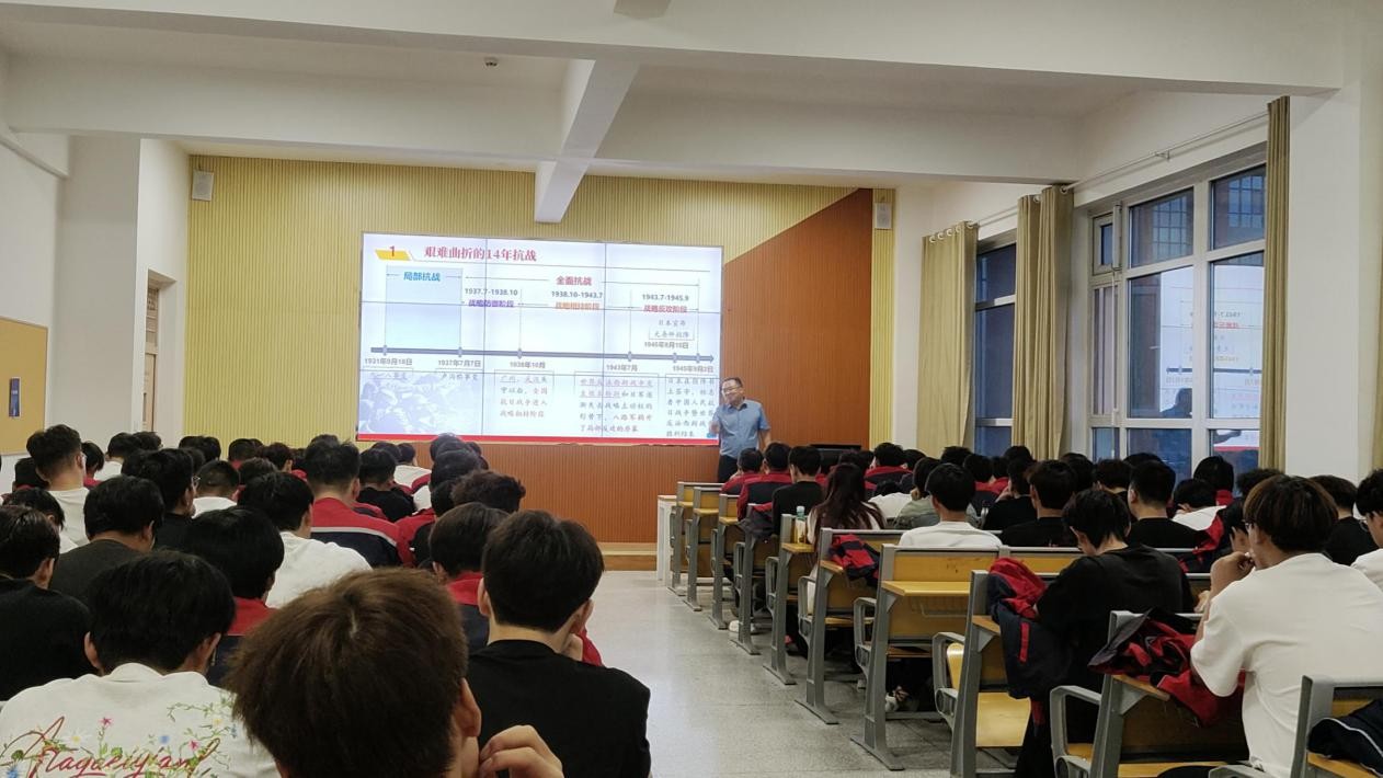 在这节思政课堂上,主讲老师带领同学们回顾了中国人民抗日战争从局部抗战到全民族抗战的艰苦卓绝的历程,深刻阐释了中国人民以巨大民族牺牲支撑起世界反法西斯东方主战场的历史贡献,讲述了全体中华儿女在国家危亡之际,共赴国难、浴血奋战的英雄史诗,深入解读了抗战精神的丰富内涵——天下兴亡、匹夫有责的爱国情怀,视死如归、宁死不屈的民族气节,不畏强暴、血战到底的英雄气概,百折不挠、坚忍不拔的必胜信念。鼓励青年学子要立足新时代,将对抗战历史的深刻认识和对伟大抗战精神的传承,转化为刻苦学习、矢志报国的实际行动,坚定“四个自信”,为实现中华民族的伟大复兴贡献青春力量。