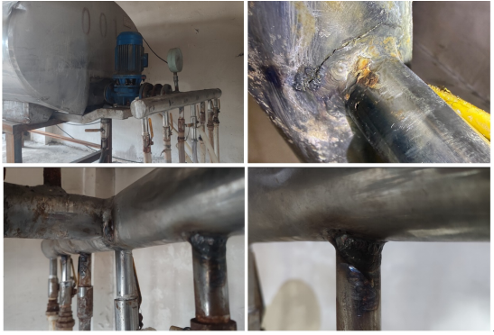2025年10月20日机电工程学院智能焊接技术专业教师带领学生前往张掖肃裕农牧开发有限公司开展技术服务。10月19日,因气温骤降,企业生产、生活储水罐出水口焊缝出现裂纹,漏水严重,影响企业生产、生活。由于储水罐及出水口材质为304不锈钢,出水口日常承压3MPa,壁厚为1~2mm,裂纹长度为5mm、且局部锈蚀,具有一定的焊接难度,当地多位焊工师傅均无法完成修复任务。我校专业教师了解修复问题后,第一时间制定技术方案,与企业协调设备、材料及工具,开展修复工作。