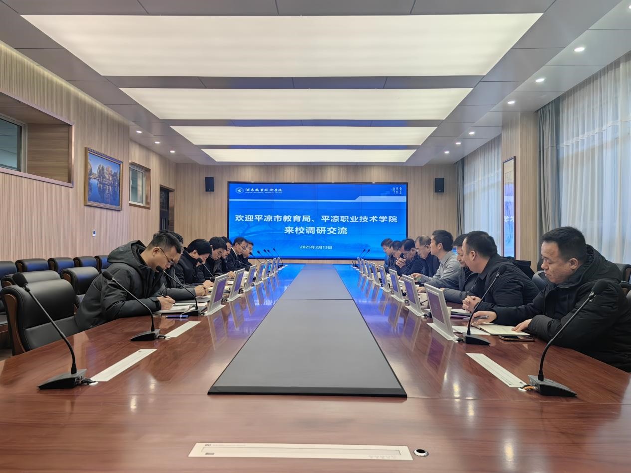 2025年2月13日,平凉市教育局党组成员、市政府教育督导机构专职督学李建忠,平凉职业技术学院党委副书记、院长王国强等一行在酒泉市教育局四级调研员、职教科科长曹锦铭的陪同下来我校考察交流。学校党委副书记、校长许军,党委委员、副校长施荣参加交流座谈会。