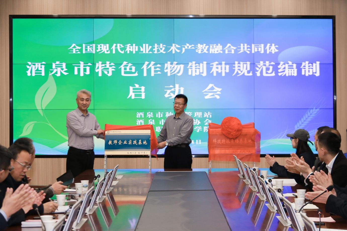 会上,王金明与王彦军共同为酒泉职业技术学院“教师企业实践基地”“科技特派员培养基地”揭牌。这一举措标志着政行企校在全市制种规范开发领域的合作迈出了重要一步。双方领导表示,制种规范编制不仅有助于提升教师的实践能力和科技特派员的培养水平,还能促进种子产业的规范化发展,推动酒泉市在特色作物制种领域的创新与进步。
