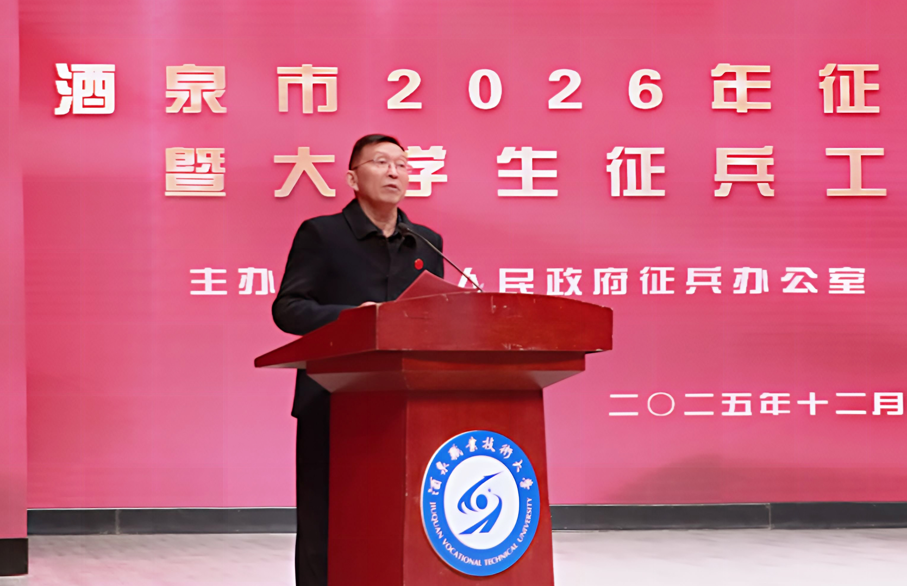 要闻快递 > 正文2025年12月19日下午,酒泉市2026年征兵宣传进校园暨大学生征兵工作启动仪式在酒泉职业技术大学胡杨活动中心举行。本次活动由酒泉市人民政府征兵办公室主办,酒泉职业技术大学、肃州区人民政府征兵办公室共同承办,旨在深入贯彻习近平强军思想,进一步激发广大青年学子投身国防、报效祖国的热情,为新时代国防和军队现代化建设输送高素质兵员。