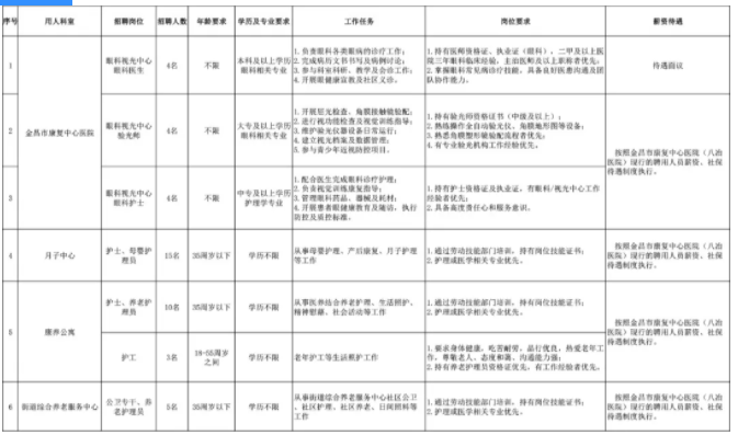 现因金昌市康复中心医院(八冶医院)所属月子中心二部扩建,康养公寓二部、眼科视光中心即将投入运营,为保证人才储备,现面向社会公开招聘工作人员,招聘相关事宜如下:
